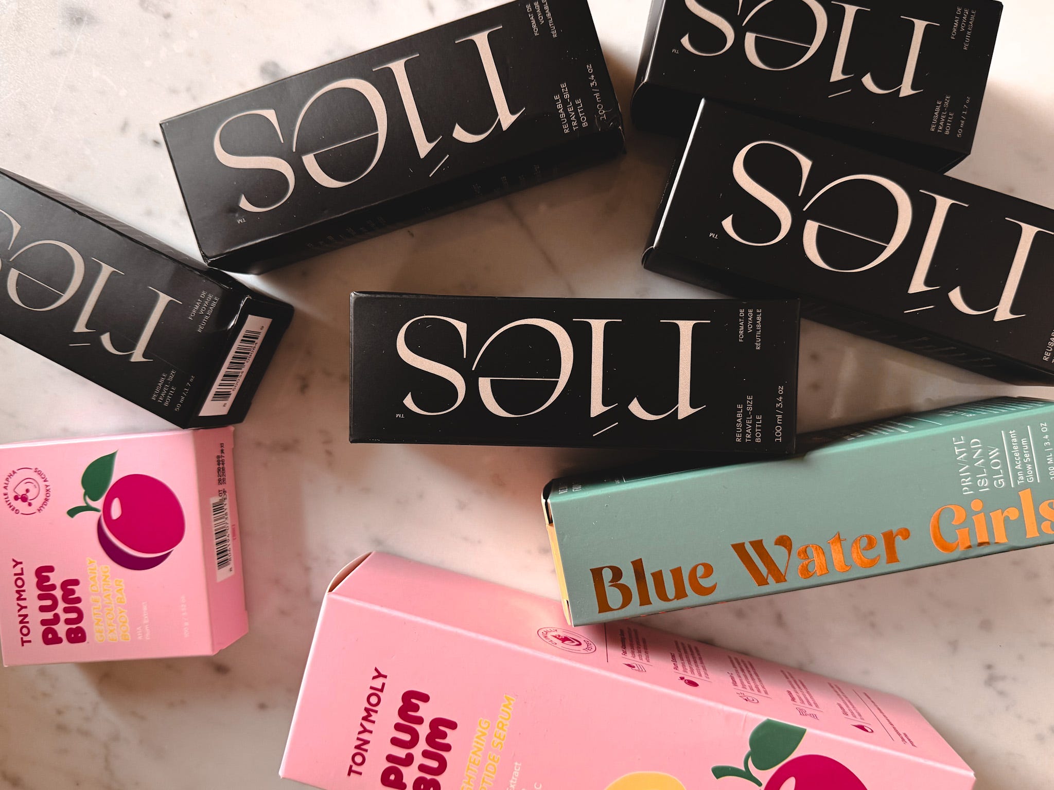 Prize: A gift box (will be mailed to the winner) featuring a travel toiletry set from Ries, Private Island Glow from Blue Water Girls, and some skin care items from Tony Moly!